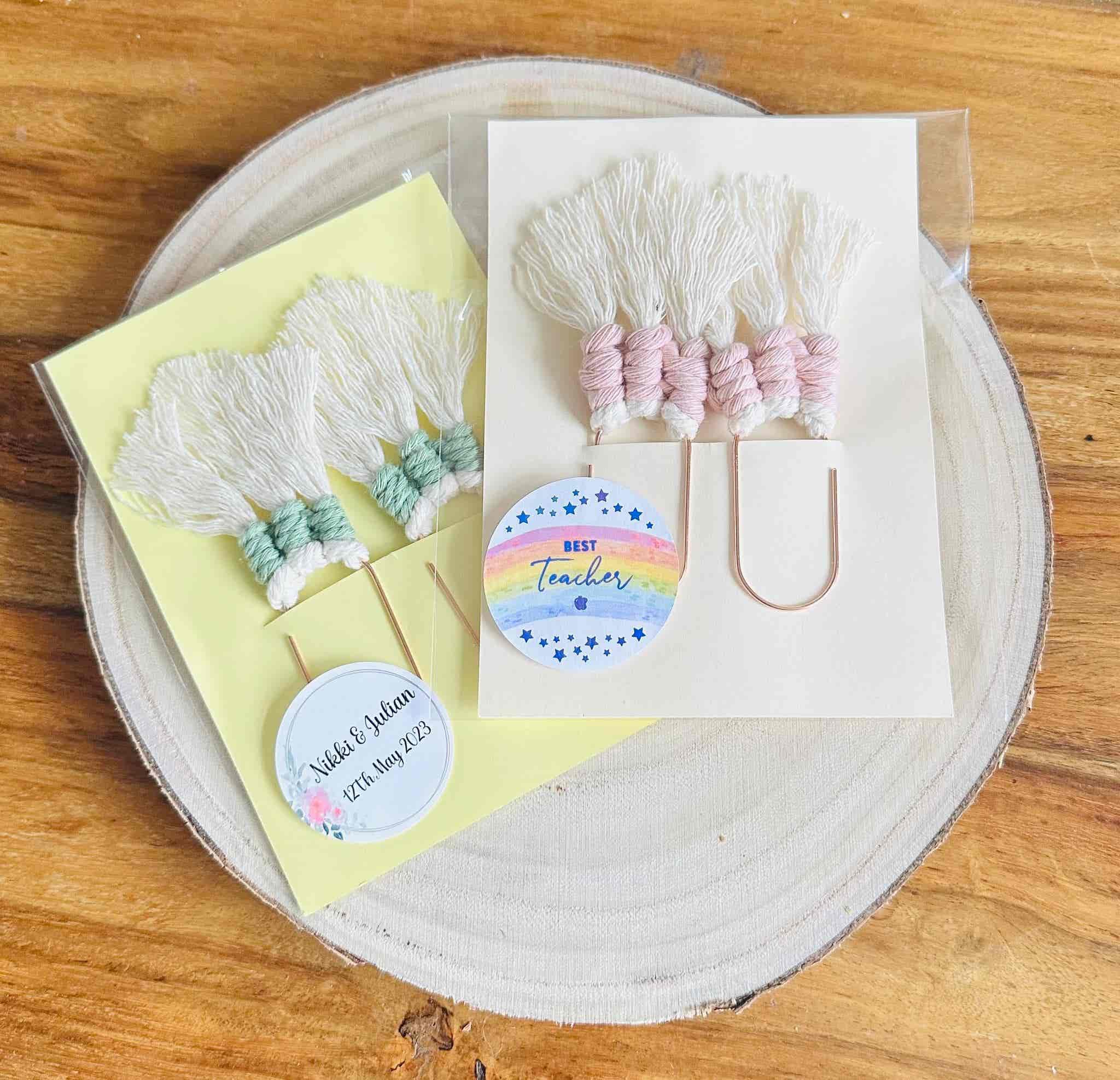 Cute oversized paperclips with macrame detailing. Available in packs of two. Ideal as wedding or baby shower favours.