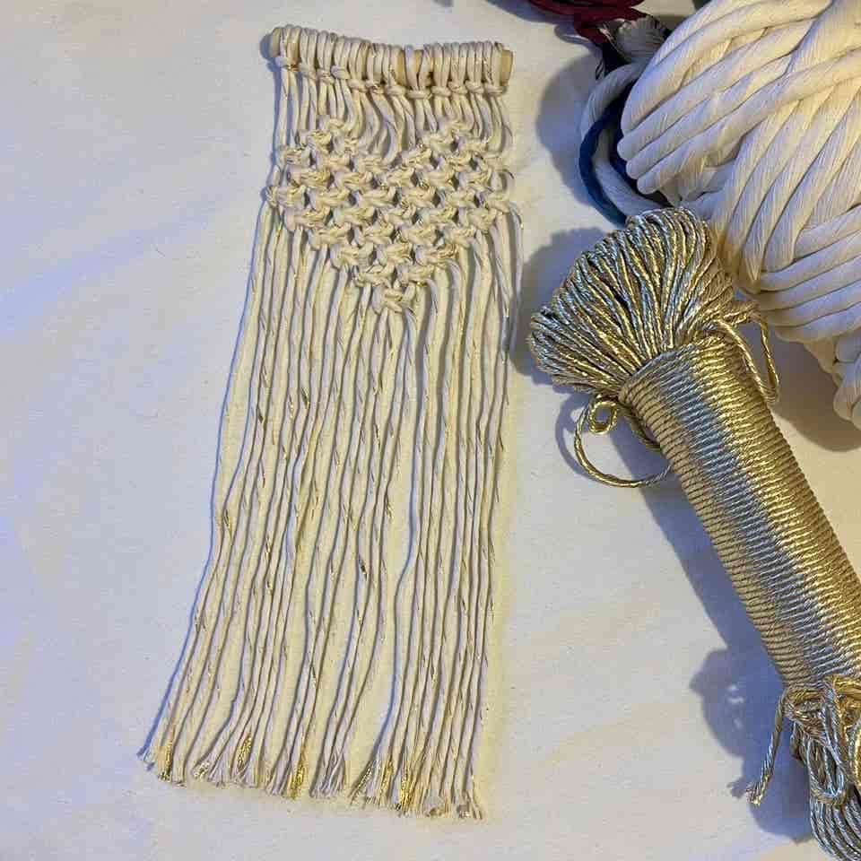 Hand knotted on a wooden dowel using natural cotton with glints of gold, this heart wall hanging is beautiful in its simplicity.
