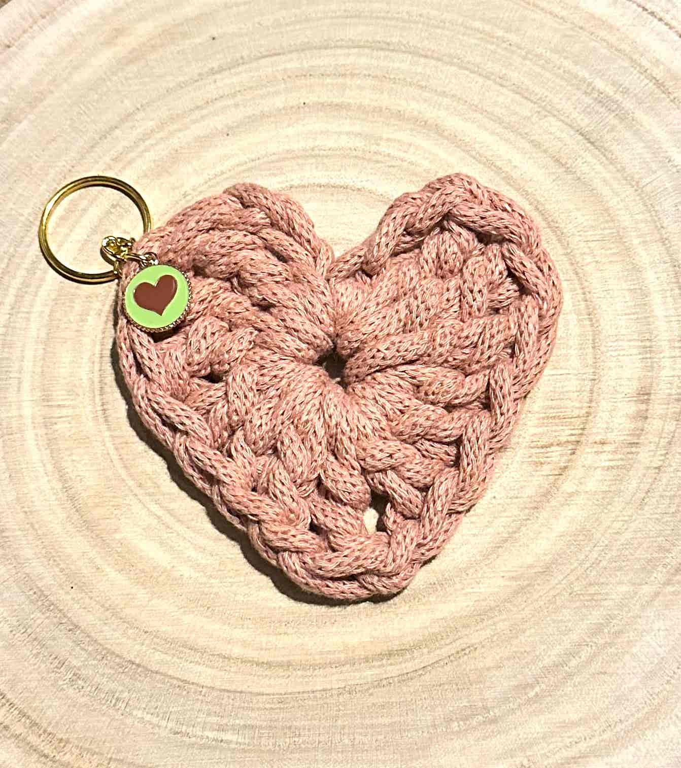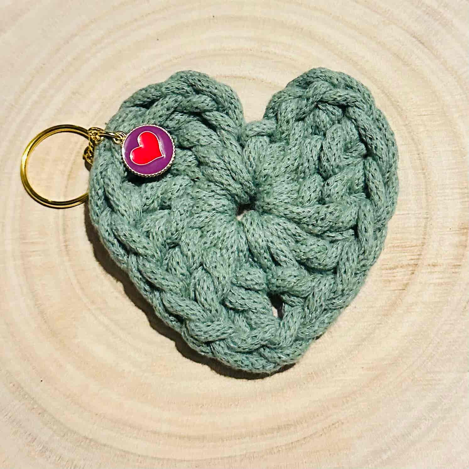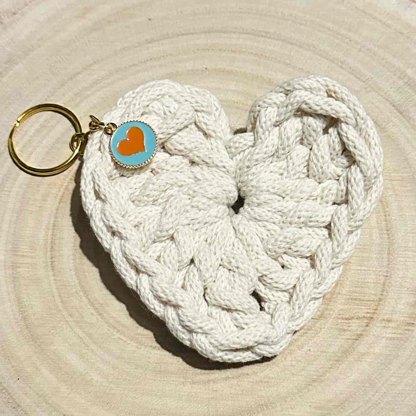Handmade heart keychain, beautifully crocheted using 100% recycled cotton cord with gold coloured key chain and enamel heart pendant. Great for attaching keys or adding a little extra cuteness to a bag.